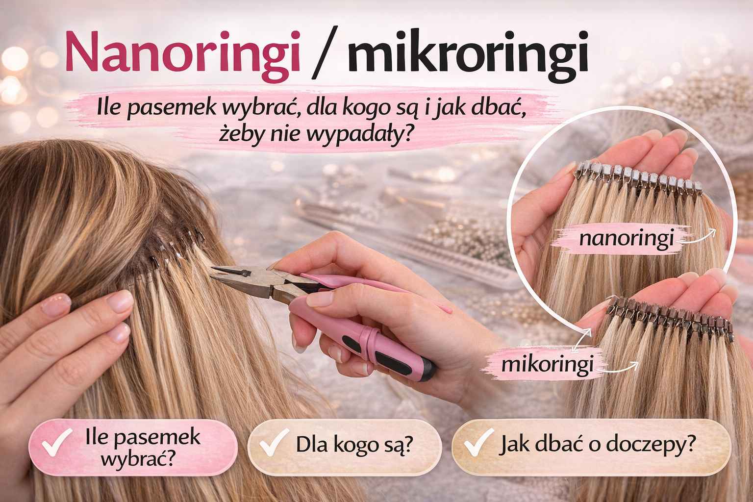 Nanoringi (często nazywane też mikroringami) to jedna z najdelikatniejszych metod salonowego przedłużania i zagęszczania włosów – bez kleju i bez wysokiej temperatury. Pasma mocuje się za pomocą małych ringów (najczęściej z silikonową wkładką), które zaciska się na cienkich pasmach Twoich włosów.
